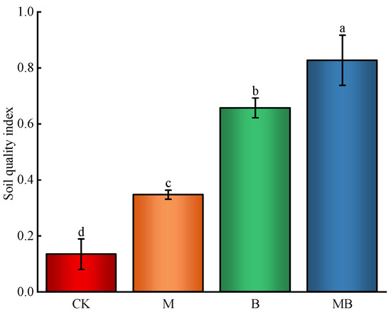 Effects of regulatory measures on soil quality index. CK denotes untreated irrigation, M denotes magnetized ionized water irrigation, B denotes untreated water irrigation with 45 kg ha−1 B. subtilis, and MB denotes magnetized water irrigation with 45 kg ha−1 B. subtilis. The data represent the average of the three replicates. Errors bars indicate standard errors. Different letters above the bars indicate significant differences among treatments at p < 0.01.