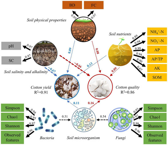 Partial least squares path modeling for the interaction between soil salinity and alkalinity, nutrients, microorganism, cotton yield, and quality.