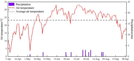 This field study was conducted in 2023 at the 7th company of the 8th regiment in Alar City, southern Xinjiang, China (N 40°37′32.26′′, E 80°52′57.78′′). Alar City, known for its warm temperate climate and extreme continental arid desert conditions, experiences significant diurnal temperature variations. In the cotton growing season of April to September 2023, the average daily temperature was 23.3 degrees Celsius, and there was a total rainfall of 13.5 mm (Figure 15). The soil properties within a 0–40 cm profile are detailed in Table 3. Prior to sowing, the average electrical conductivity from the top 40 cm of soil was 3.5 dS m−1, indicating the soil was moderately saline [64]. The average pre-sowing soil chemical properties across the 0–40 cm profile were alkali-hydrolyzed nitrogen at 70.3 mg kg−1, potassium available at 190.1 mg kg−1, phosphorus available at 39.3 mg kg−1, organic matter at 11.7 g kg−1, and pH at 8.0.