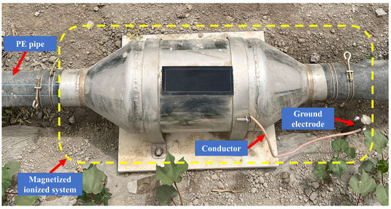 The canal water, originating from Tianshan Mountains’ meltwater, underwent filtration and pressurization in the pump room before flowing into the field through buried pipelines. At the field pipeline outlet, a 90 mm polyethylene (PE) pipe connected to a magnetized ionized device was installed. The magnetized ionized system (Xi’an Wangkaiyue Metal Products Co., Ltd., Xi’an, China) comprised a magnetized device, ground electrode, and conductor (Figure 16). Utilizing a permanent rubidium magnet ring with a magnetic field intensity of 3000 Gs, the magnetizer achieved a grounding resistance of 5 Ω, connecting the ground bolt to the ground electrode through a wire. The canal water, not passing through the magnetized ionized system, is termed non-magnetized–ionized water (NMIW), while water passing through is magnetized ionized water (MIW) (Figure 17). Magnetization and ionization treatment altered the water surface tension from 66.8 to 64.0 mN m−1 in this study.