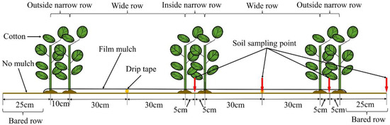 In drip irrigation settings, cotton roots primarily exist in the 0−40 cm soil layer [66], thus this layer was designated as the cotton’s principal root zone for further analysis. Bulk density and field capacity measurements were conducted in both wide and narrow rows (Figure 18) using the cutting ring method [67]. Soil samples were collected at depths of 0, 10, 20, 30, and 40 cm below the surface during the critical boll stage of cotton growth.