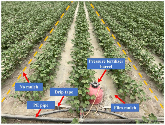 The experiment comprised four treatments: untreated irrigation (CK), irrigation with magnetized ionized water (M), untreated water irrigation with 45 kg ha−1 B. subtilis added (B), and irrigation with magnetized water with 45 kg ha−1 B. subtilis added (MB). The application rate of B. subtilis is determined based on the research of Jiang et al. [65]. Every experimental plot was 2 m wide and 30 m long, with each treatment repeated three times in a randomized block layout. B. subtilis (LV-01), provided by Shandong Lvlong Biotechnology Co., Ltd. (Weifang City, Shandong Province, China), was in wettable powder form, containing 20 billion viable spores per gram. The initial cotton irrigation event (6 June 2023) utilized pressure fertilizer barrels for its application through the drip irrigation system, as shown in Figure 17.