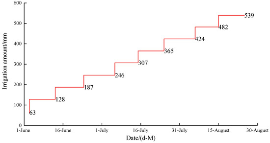 On 16 April 2023, cotton cultivar Tahe No.2 (Gossypium hirsutum L.) was cultivated and subsequently harvested on 20 September 2023. There were 180,000 plants per hectare, each spaced 10 cm apart. This cultivation employed a drip irrigation system and plastic film mulch, as depicted in Figure 18 and Figure 19. The drip irrigation system followed a sequential row spacing pattern of 10 cm (outside narrow), 60 cm (wide), 10 cm (inside narrow), 60 cm (wide), and again 10 cm (outside narrow). Two irrigation lines were placed every six rows, beneath a 1.5 m wide plastic covering with a 50 cm space between each covering. The 1.6 cm diameter drip lines had emitters spaced 30 cm apart. The irrigation scheduling of this experiment was regulated by the local government to ensure the reasonable allocation of water resources in Xinjiang. The irrigation interval ranges from 7 to 10 days. There is no specified amount of water to be used during irrigation, as each irrigation event is restricted by local government regulations to last no longer than 5 h. In this experiment, each irrigation lasted a full 5 h. Irrigation commenced on 6 June 2023, with a total water application of 539 mm recorded. The irrigation scheduling of this experiment is shown in Figure 20.