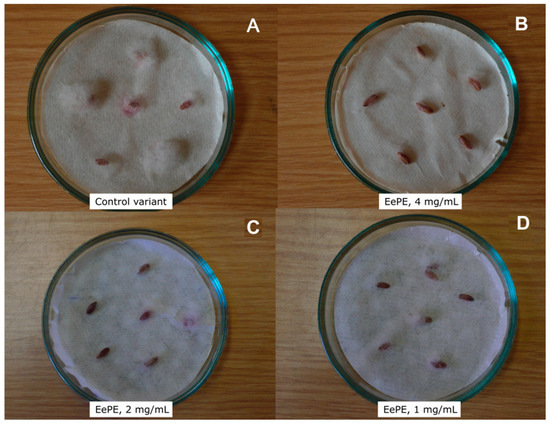 The effectiveness of the EePE from E. elongata was also examined on wheat (T. aestivum) grain. Briefly, the wheat grain was pretreated with EePE, then inoculated with one susceptible phytopathogenic fungus, F. graminearum (Figure 1). Initially, it was planned for this experiment to be carried out under natural conditions. However, the wheat grain batches had an extremely low degree of seed contamination. Consequently, the study parameters were changed in favor of an artificial background. It is worth noting that experimental batches of untreated grain may have a rather high baseline level of contamination with fungi as well as bacteria. This obfuscates the interpretation of test results and blurs the effect of the antimicrobial tested. The EePEs demonstrated a protective effect at the highest concentration tested—4 mg/mL—where fungal development did not exceed 20%, which corresponds to “++” in the mark scale (Figure 1B). In comparison with the control variant, the effect manifested by F. graminearum growth suppression on pretreated grain (Figure 1A) was retained over time. However, when treated at half and quarter concentrations—2 and 1 mg/mL—the protective effect was less pronounced but still distinguishable (Figure 1C,D).