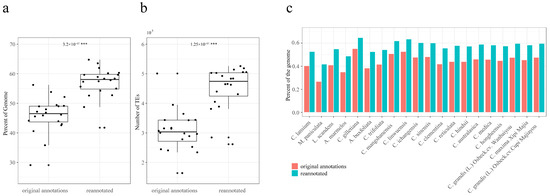 TE re-annotations using the pan-genome TE library. (a) Comparisons of the TE proportions between originally annotated and re-annotated genomes. (b) Comparisons of TE numbers between originally annotated and re-annotated genomes. (c) TE contents of originally annotated and re-annotated genomes. p values less than 0.001 are indicated with ***.