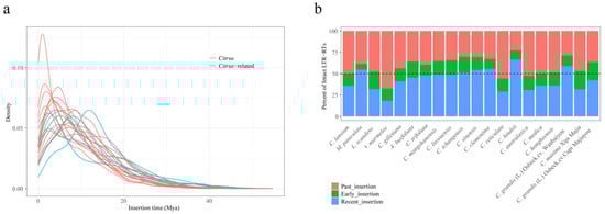 The insertion times of LTR retrotransposons (LTR-RTs). (a) Distributions of LTR-RT insertion times in each genome. Red lines and blue lines represent genomes in Citrus and Citrus-related genera, respectively. (b) The percentages for different types of LTR-RTs. Recent insertion represents the TE inserted at 0–6.84 Mya, early insertion represents the TE inserted at 6.84–10 Mya, and past insertion represents the TE inserted before 10 Mya.