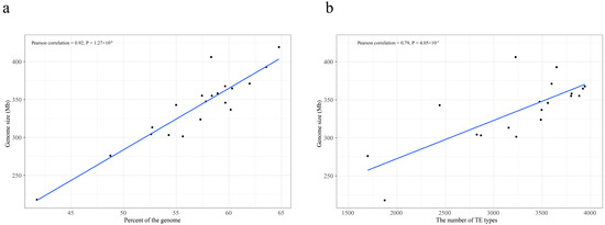 Correlation analysis between genome size and content of TEs (a) and between genome size and the number of TE types (b) in 20 genomes.