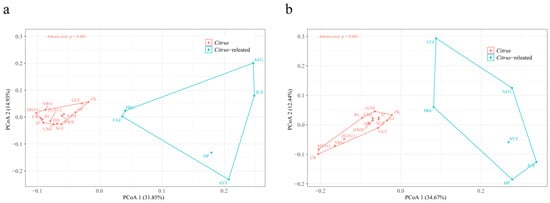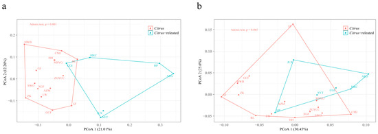 PCoA plots for KEGG identifier distribution of genes that overlapped with intact TEs (a) and KEGG identifier distribution of genes that overlapped with fragmented TEs (b) between the Citrus and Citrus-related accessions. The closer the spatial distance of the sample, the more similar the KEGG identifier composition of the sample. The statistical differences of PCoA were calculated by an Adonis test. A. marmelos, A. buxfoliata, C. gilletiana, C. lansium, L. scandens, M. paniculate (AEG, HKC, CGI, HP, SYT, JLX) were defined as Citrus-related accessions; C. trifoliata, C. mangshanensis, C. linwuensis, C. ichangensis, C. sinensis, C. clementina, C. reticulata, C. hindsii, C. australasica, C. medica, C. hongheensis, C. grandis (L.) Osbeck cv. Wanbaiyou, C. maxima Xipi Majia, C. grandis (L.) Osbeck cv. Cupi Majiayou (ZK, MSYG, LW, ZGYCC, SWO, GCF, JZ, GJ, AZM, RL, HH, HWB, XGF, CMJ) were defined as Citrus accessions.