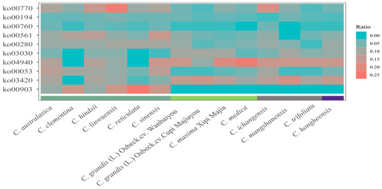 Functional genes were identified by analyzing the intersection between intact TEs and mRNA, along with their promoters. The number of identified genes in each Citrus accession ranged from 1051 to 3879. An unpaired Wilcoxon test was used to compare low-bitterness and high-bitterness samples, with the limonene and pinene degradation (ko00903) pathway ranking first among 445 pathway entries based on p-value (Figure 6). Only aldehyde dehydrogenase (ALDH) (K00128), a key enzyme in the glycolysis/gluconeogenesis (ko00010) and ascorbate and aldarate metabolism (ko00053) pathways, was involved in the limonene and pinene degradation pathway in our datasets, suggesting that K00128 genes may play a key role in bitterness.