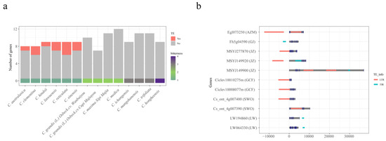 Based on functional annotation of each genome, a total of 217 candidate genes were identified under the K00128 identifier. A conserved domain search of the National Center for Biotechnology Information (NCBI) database revealed a high confidence level (specific hit) between 206 gene sequences and the Conserved Domain Database (CDD) model. Results showed that 184 of these genes belonged to the aldehyde-alcohol dehydrogenase family (AdhE), including 101 genes containing ALDH active sites (Supplementary Table S4). The intersect screening between intact TEs and the 184 genes and their promoters indicated that 11 genes, all from low-bitterness samples, overlapped with intact TEs (Figure 7a); TIRs and LTR-RTs were involved in these insertion events (Figure 7b). No assembly gaps were found near the 11 genes, indicating their reliability. These findings suggest that the presence and absence of intact TEs near the AdhE superfamily may be highly correlated with the biosynthesis of limonene, a major contributor to bitterness in Citrus fruit.