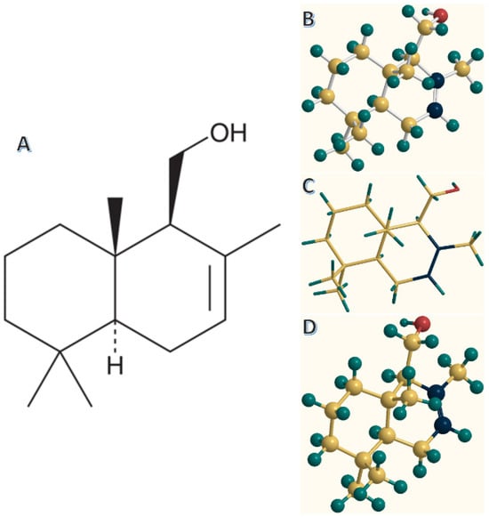Drimenol is a sesquiterpene alcohol with diverse natural bioactivities [26]. Sesquiterpenoids are natural compounds with a 15-carbon frame skeleton that are considered to be important for plant protection and for humans, presenting many biological activities, such as anti-inflammatory, antioxidant, antimicrobial, antitumor, and cytotoxic properties [27,28,29]. Drimenol was first isolated in 1948 from the bark of the aromatic plant Drimys winteri Forst (DW), which is used as a food flavoring and pepper replacement in Argentina and Chile [30]. Its absolute configuration was identified by Appel et al. [31], with the chemical structure displayed in Figure 1. The molecular formula of drimenol is C15H2O6, with a molecular weight of 222.37 g/mol and an appearance of colorless to pale-yellow liquid. Its density is 0.92 g/cm3, boiling point is 260–262 °C at 760 mmHg, and flash point is 110 °C. It was the first bicyclic sesquiterpene with the structure and absolute configuration characteristic of the A, B ring system of many di- and triterpenes [32] and sesquiterpenoid primary alcohol, being methanol in which one of the methyl hydrogens is substituted by a 2,5,5,8a-tetramethyl-1,4,4a,5,6,7,8,8a-octahydronaphthalen-1-yl group. It is also known as [(1S,4aS,8aS)-2,5,5,8a-Tetramethyl-1,4,4a,5,6,7,8,8a-octahydro-1-naphthalenyl] methanol [ACD/IUPAC name]. This unique structure is responsible for its characteristic odor, often described as sweet, woody, and slightly earthy [33]. Drimenol is soluble in various organic solvents, such as ethanol, methanol, dimethyl sulfoxide, and dimethyl formamide. However, drimenol is insoluble in water.