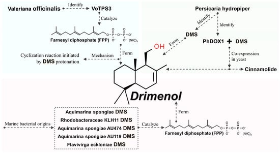 Consequently, other researchers have focused on DMS, discovering five DMSs of marine bacterial origin [24]. These include two recombinant proteins (Aquimarina spongiae DMS and Rhodobacteraceae KLH11 DMS) and three candidates (Aquimarina spongiae AU474 DMS, Aquimarina spongiae AU119 DMS, and Flavivirga eckloniae DMS), all of which catalyze the biosynthesis of drimenol from FPP [24]. The overall biosynthesis mechanism of drimenol is illustrated in Figure 2.