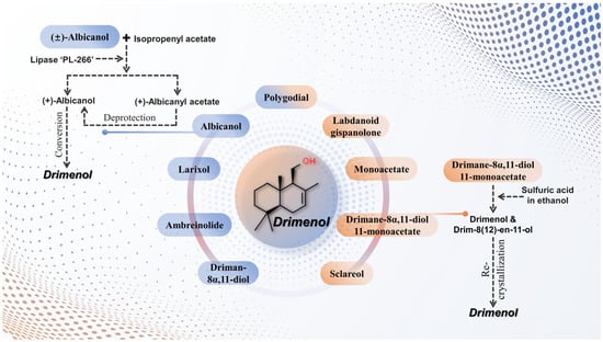 Besides biosynthesis pathways, drimenol can be obtained by chemical synthesis. The relatively low content of drimenol in natural sources has spurred studies on its synthetic production [139]. Several methods for drimenol synthesis have been developed (Figure 3). For instance, Akita et al. [140] used lipase ‘PL-266’ from Alcaligenes sp. to perform the enantioselective acetylation of albicanol with isopropenyl acetate, resulting in enantiomerically pure albicanyl acetate and albicanol. Subsequent deprotection of albicanyl acetate produced natural albicanol, which was then converted into drimenol [140].