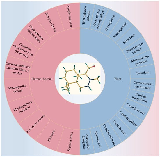 Drimenol is a broad-spectrum antifungal agent effective against a wide range of pathogenic organisms, as illustrated in Figure 4. Previous studies have reported its antifungal activity against various pathogenic fungi. It has been determined that the presence of a Δ7,8-double bond in the drimane skeleton of drimenol is a critical structural feature for its antifungal efficacy. Additionally, the aldehyde group at C-9 appears to be non-essential for its activity [127]. To have a comprehensive understanding of its antifungal potential, we summarized the effects of drimenol on various fungi pathogenic to humans, animals, and plants, as well as its mechanisms of action in several fungal species.