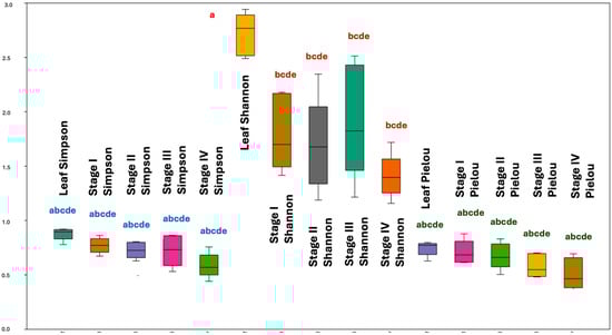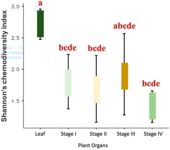 As there was a significant difference in chemodiversity between the leaves and reproductive organs, considering the Shannon index by ANOVA (Figure 1), we applied the Tukey Post-Hoc test to compare these different compartments (Table S4 and Figure 2). These analyses revealed that the chemodiversity of the EO from the leaves and stage III (anthesis) showed significant similarity (p = 0.103). However, there is a significant difference (p < 0.05) between leaves and the other stages of the reproductive organ (I, II, and IV), with the EO from the leaves being the most chemodiverse compared with these stages. Additionally, the EO from stage IV (which presents immature drupes) has the lowest richness in constituents. The average richness given by the Shannon index of constituents between stages I to IV was not statistically different (p > 0.05) (Table S4 and Figure 2).