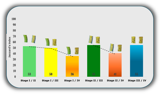 Although the richness of the samples may be comparatively equal, how equal, in terms of chemical constituents, are they actually? To answer this question, the Jaccard index was used, aiming to deepen the study of chemodiversity concerning the dichotomy of the chemical profile among the samples studied. This index was used because it represents chemodiversity β and it was applied to the reproductive structures to compare the similarity between chemical constituents [38]. The results confirm the low similarity between stages I and II (53%), and between stages I and III (50%). Between stages I and IV, the similarity was even lower (36%), indicating that the development of the reproductive organ leads to chemical phenotypic diversity (Figure 3). The data from this analysis indicate chemical similarity between one stage and the next, as evidenced by the Jaccard indices between stages II and III (55%) and III and IV (55%). However, there was a gradual decrease in similarity between subsequent stages (stage II and IV—41%). This suggests that, as development progresses, the chemical similarity between stages tends to decrease.