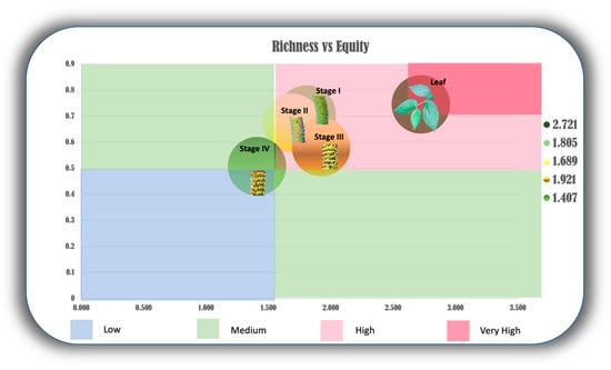Our studies infer that EO synthesized with higher richness (Shannon index) and evenness (Pielou index) in P. mollicomum may be more attractive to insects. Leaves were the most “Equidiverse” * organs (* a term proposed by the authors to express the idea of an abundant and uniform chemical profile). Stages I, II, and III also exhibited high equidiversity, indicating that, at different stages of reproductive organ maturation, they may present a volatile composition with high diversity and uniformity. This is so for two vital reasons: protection of these developing structures (stages I and II), and attraction of insects for the dispersal of their generative whorls (stage III) [11,26,30]. On the other hand, stage IV showed low equidiversity, which allows us to infer that there is a channeling of adaptive metabolism towards survival in these structures, which corroborates the perspectives of the drain effect [83]. For example, a recent investigation, which focused on the analysis of the chemical composition of EO from Satureja hortensis L., revealed the presence of a notable diversity and uniformity of volatile constituents in this plant. The research emphasized the synergistic effects demonstrated by the substances, which showed relevant insecticidal properties in combating pests [85].