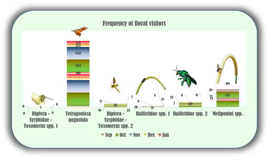 The data from potential pollinator observations show that bees and flies were the most frequently observed insect groups that visited P. mollicomum blooming inflorescences in 4332 instances (Figure 5). Bees were the most incident visitors, showing high visits on all surveyed days. The most frequent floral visitor, Tetragonisca angustula Latreille, 1811, was recorded as having a prominent number of visits, totaling 3042 interactions. Another Hymenoptera, belonging to the Colletidae insect family, stood out with a considerable 820 visits. Two other bee species belonging to the family Halictidae were recorded with frequencies of 238 and 67, respectively. Dipteran insects, on the other hand, showed distinct visitation rates, as one species of the Syrphidae family was the fourth most frequent insect, with 164 visits while another was observed only once on the blooming inflorescences, at the beginning of flowering (Figure 5).