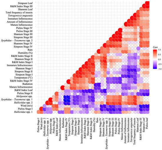 Finally, a negative correlation was also observed between the frequency of visits from some potential pollinators, such as Meliponini spp., one species of Syrphidae, and others of Halictidae, and the R&M in stage IV. This suggests that the more oxidized the mixture of volatile compounds at that stage, the lower the frequency of insect visits. Similarly, when the metabolite mixture of the EO is reduced further, there is an increase in the visitation of potential pollinators to the flowering inflorescences. Additionally, the analyses revealed negative correlations between the chemodiversity α indices (leaves and stage II).