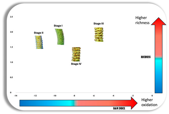 Figure 6 shows the Pearson analyses carried out to assess the potential correlations between the variability in microclimate data and the frequency of visits by potential pollinators versus chemodiversity and the Ramos and Moreira indices (R&M). For instance, a strong positive correlation was identified between the R&M of stage III and the chemodiversity α indices of the leaves (p < 0.05). As the diversity, richness, and evenness of volatile constituents increased, the EO compounds of the flowering inflorescence at anthesis (stage III), as well as that of the leaves, tend to become more oxidized. A positive correlation between the R&M in the early stages of inflorescences (I and II) and the chemodiversity α indices of stage IV was also identified. This relationship remained consistent throughout the different stages of the analyzed inflorescences, suggesting that, as the volatile mixture becomes richer and more diversified, it becomes concurrently and proportionally more oxidized (Figure 7).