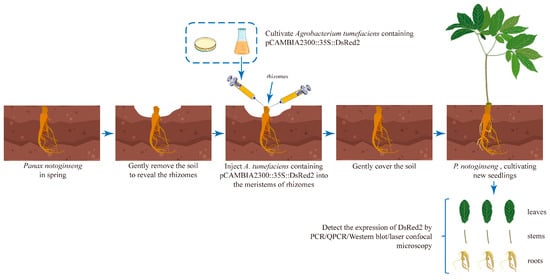 In spring, the soil above the P. notoginseng rhizome was gently removed before the germination of tender shoots. A. tumefaciens LBA4404 containing pCAMBIA2300::35S::DsRed2 was injected into the rhizome of P. notoginseng using a syringe at two positions with one injection per position (Figure S4). A total of 5 μL of bacterial solution was injected into each position (Figure 1). Then, the soil was moved so that it gently covered the rhizome. In total, 71 P. notoginseng rhizomes were injected with A. tumefaciens.