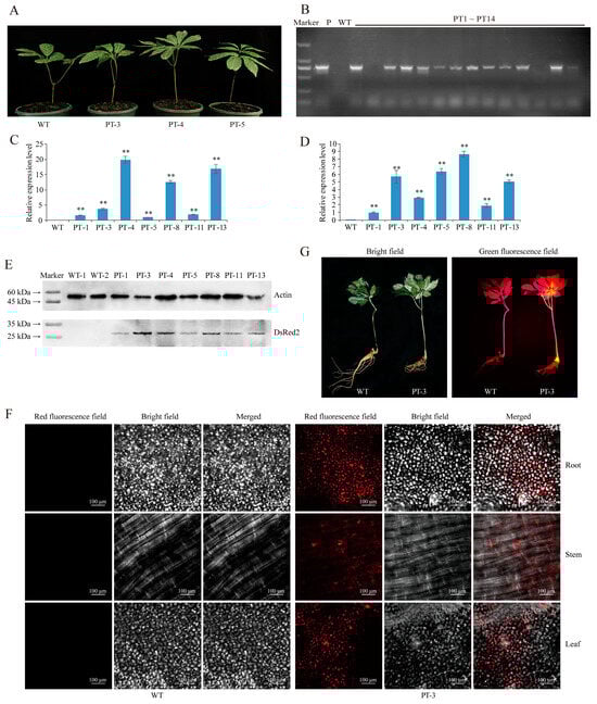The leaves from 71 plants derived from injected rhizomes were used to extract the genomic DNA, and the wild-type P. notoginseng was included as the negative control in the PCR analysis and subsequent experiments. Gel electrophoresis of the PCR products revealed that 61 plants contained the DsRed2 gene in their genomes (Figure 2B and Figure S1). The transformation rate was approximately 85.91%. Furthermore, qRT-PCR analysis confirmed the accumulation of a large number of DsRed2 transcripts in both the leaves and stems of seven positive transgenic P. notoginseng plants (Figure 2C,D), with PT-4 and PT-8 showing the highest expression levels in the stems and leaves, respectively.