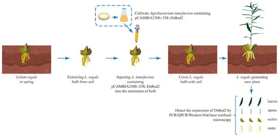 Similarly, one-year-old L. regale bulbs were collected from the soil before sprouting. A 5 μL bacterial solution was sucked with a syringe, and the needle was vertically inserted into the meristems of the L. regale bulb to inject the A. tumefaciens (Figure 3 and Figure S5). After this injection, each L. regale bulb was cultured at 28 °C in the dark for 2 days before being planted in the nutrient soil. In total, 82 L. regale bulbs were subjected to injection.