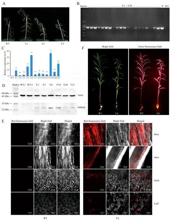 A. tumefaciens injection into the meristems of the L. regale bulb is a fast and efficient transformation method. (A) Comparison of phenotype between the injected L. regale plants (T-1/2/3) and wild-type (WT) plant. (B) Gel electrophoresis showing DsRed2 amplification from injected L. regale leaves. T-1~T-20, P, and WT represent PCR reaction of DsRed2 transgenic L. regale, pCAMBIA2300S-DsRed2 plasmids, and wild-type, respectively. (C) Expression of DsRed2 in leaves of transgenic L. regale as determined by qPCR. WT and T-1/2/3/5/6/7/9/10/11/19/20/21 represent qPCR reaction of the wild-type and DsRed2 transgenic L. regale plants. (D) Detection of DsRed2 protein expression in leaves of transgenic L. regale through Western blot. WT and T-1/5/6/19/20/21 represent the leaf total protein of wild-type and DsRed2 transgenic L. regale plants. (E) Observation of specific red fluorescence in leaves, stems, roots, and scales of transgenic L. regale under a laser scanning confocal microscope. WT and T-6 represent the wild-type and DsRed2 transgenic L. regale plants, respectively. (F) Observation of specific fluorescence in transgenic L. regale with a handle fluorescence detector. WT and T-6 represent the wild-type and DsRed2 transgenic L. regale in the second year after injection, respectively. T-test was used to reveal the statistical difference of DsRed2 expression level between wild type and transgenic plants (** p < 0.01).
