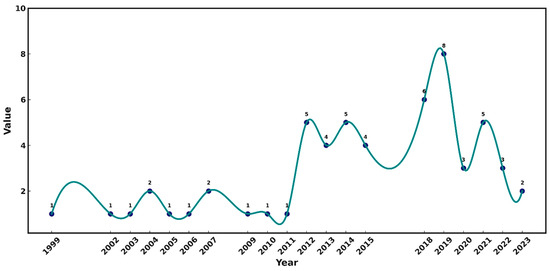 Figure 1 shows that the publications related to the use of L-band SAR data in the field of forest canopy penetration first appeared in 1999, indicating a relatively late start. From 1999 to 2011, there is only one SCI paper published each year, which indicates the stage of slow development. From 2012 to 2023, the annual number of the published papers increased to more than two, reaching the peak of eight in 2019. The fastest growth happened from 2012 to 2019, indicating that the research in this field was in a rising stage of rapid development, and then a decreased trend was found.