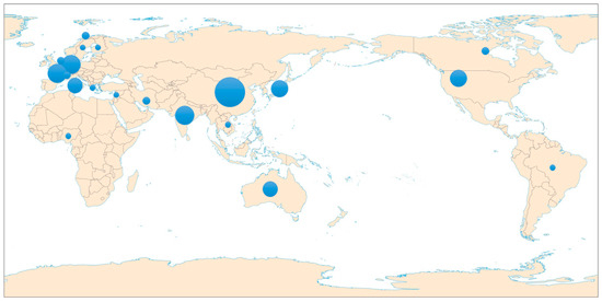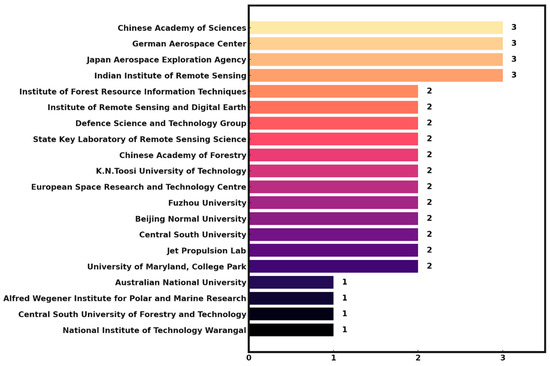 The top-20 national research institutions in which the authors published their papers in the field of L band SAR data applications and forest canopy penetration from January 1978 to April 2024 are shown in Figure 3. The institutions can be divided into three groups. The top group includes the Chinese Academy of Sciences, the German Aerospace Center, the Japan Aerospace Exploration Agency and the Indian Institute of Remote Sensing, in which there are three papers in this field for each institute. The second group consists of 12 research institutions, each publishing two articles in this field. The last group is composed of four institutes in which there is only one publication each.