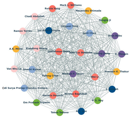 From January 1978 to April 2024, the world’s top-30 first authors who studied the use of L band SAR data and forest canopy penetration are shown in Figure 4. The author who produced the largest number of the papers in this field is Mark L. Williams, with three papers in total. Yasser Maghsoudi, Matteo Pardini, Mohammad Javad Valadan Zoej, Marco Lavalle, Tayebe Managhebi and Masanobu Shimada tied for second place, with two publications. The authors with one publication include Liming Jiang, Om Prakash Tripathi, A.K. Milne, Junli Chen, Chadi Abdallah, J. Jomaah, Masato Hayashi, Jyotishman Deka, Michael F. Toups, Kiran Dasari, P. S. Roy, Fulong Chen, Qingwei Tong, A.C. Lee, Wei Li, Ruixia Yang, Takeo Tadono, Shashi Kumar, Lal Bihari Singha, Jean Luc Betoulle, Nicolas Baghdadi, E. Mougin, and Van Nhu Le.