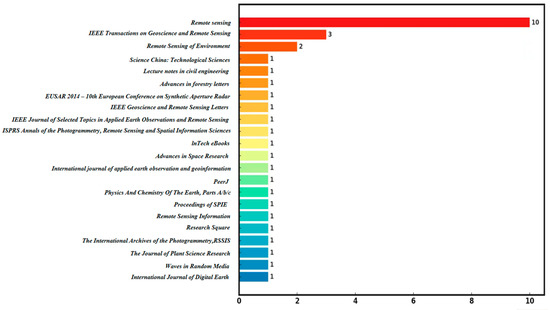 From January 1978 to April 2024, the top 22 journals in terms of the publications dealing with L-band SAR data and forest canopy penetration are shown in Figure 5. Remote Sensing is the journal with the largest number of publications (10). IEEE Transactions on Geoscience and Remote Sensing ranked second, with three articles, and Remote Sensing of Environment ranked third, with two papers. There are another 19 journals with one publication.