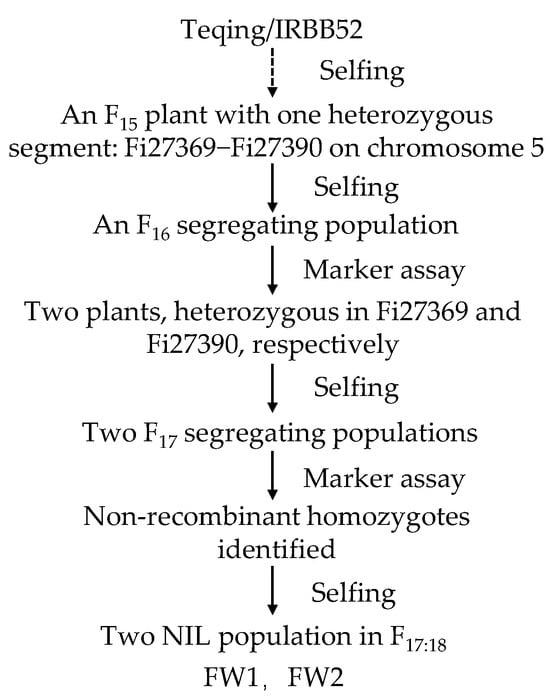 Firstly, two F17:18 NIL populations carrying the heterozygous region Fi27369−Fi27390, FW1, and FW2, were used to narrow down the region of the qGL5.2. As illustrated in Figure 1, FW1 and FW2 were derived from an F15 single plant of the cross TQ/IRBB52. Each of them consisted of 35 NIL-TQ homozygous lines and 35 NIL-IRBB52 homozygous lines in the segregating region. At maturity, four traits—1000-grain weight (TGW), grain length (GL), grain width (GW), and the ratio of grain length to grain width (RLW)—were measured.