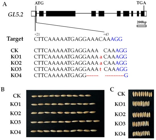 Os05g0551000 knock-out (KO) mutants were produced to validate the effects of qGL5.2. Using the CRISPR/Cas9 system, four independent T0 homozygous mutants, KO1, KO2, KO3, and KO4, were produced from the recipient R780, a NIL carrying the IRBB52 allele in the qGL5.2 segregating region. KO1, KO2, and KO3 had a 1 bp insertion (A) at +38 in the 1st exon, causing frameshift mutation at the 13th amino acid (AA) and premature termination at the 60th AA. KO4 had an 8 bp detection at the +35 position, which caused frameshift mutation at the 12th AA and premature termination at the 51st AA (Figure 3A).