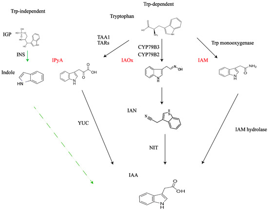 Auxin is synthesized in plants via several pathways [49]. The metabolism of IAA mainly can be divided into two kinds synthesis pathways: tryptophan (Trp)-dependent and tryptophan-independent [50,51] (Figure 3). Wang et al. (2020) suggested that the cytoplasmic enzyme indole synthase (INS) may be a key enzyme in the Trp-independent IAA biosynthetic pathway [52]. However, little is known about the molecular components and physiological functions of the Trp-independent pathway. The tryptophan-dependent auxin synthesis pathway dominates in plants, and IAA synthesis pathways are classified as the indole-3-acetaldoxime (IAOx) pathway, the indole-3-acetamide (IAM) pathway, and the indole-3-pyruvate (IPyA) pathway [53] (Figure 3). The indole synthase gene (INS) is the primary gene in the tryptophan-independent auxin synthesis pathway [54]. Indole, also known as indole glycerophospholipid (IGP), is a key node in both the tryptophan-dependent and tryptophan-independent pathways of auxin production [55]. The following focuses on the tryptophan-dependent auxin synthesis pathway. It is mainly mediated by transaminases and decarboxylases [56].