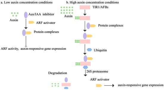 The auxin signaling pathway consists of auxin/IAA transcriptional inhibitors, auxin response factors (ARFs), and receptor proteins transport inhibitor response 1 (TIR1)/auxin-signaling F-box (AFB) (Figure 4) [134]. When auxin concentrations are low, Aux/IAA inhibitors bind to the ARF transcription factor, thereby inhibiting ARF activity. The binding of auxin to receptor TIR1/AFBs allows TIR1 to easily bind Aux/IAA proteins and induces a ubiquitination reaction [135]. Following degradation by the 26S proteasome, the AUX1/IAAs protein complex releases ARF, thereby initiating the regulation of downstream genes [136]. Research has shown that four Aux/IAA-ARF combinations, known as auxin signaling modules, are related to different stages of lateral root growth [137].