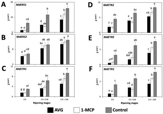 Transcript accumulation of all the assessed ethylene-perception-related genes showed a significant increase throughout the three assayed ripening stages for all the evaluated treatments (Figure 3). When comparing within each ripening stage, at CH and CH + 1W, the statistically highest transcript accumulation for MdERS1, MdETR1, MdETR2, MdETR5, and MdCTR1 was observed for the control fruit, followed by 1-MCP and by AVG-treated fruit which displayed no significant differences between them (Figure 3). At CH + 2W, the highest transcript accumulation for MdERS1, MdETR1, MdETR2, MdETR5, and MdCTR1 was observed for the control fruit, followed by 1-MCP-treated fruit and finally by AVG-treated fruit with the significantly lowest values. In the case of MdERS2, there were no significant differences amongst treatments within any of the three assessed ripening stages (Figure 3).