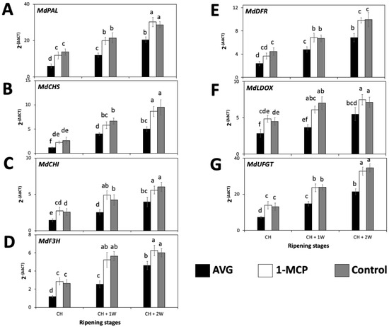 AVG and 1-MCP impacts on the relative expression of anthocyanin-biosynthesis-related genes of ‘Honeycrisp’ apples throughout ripening on-the-tree in Aspers, PA. (A) MdPAL, (B) MdCHS, (C) MdCHI, (D) MdF3H, (E) MdDFR, (F) MdLOX, (G) MdUFGT. Apples were assessed at commercial harvest (CH), 1 week after CH (CH + 1W), and 2 weeks after commercial harvest (CH + 2W). Values are means ± standard error. Different letters indicate significant differences (p ≤ 0.05) according to Tukey’s HSD test. Phenylalanine ammonia-lyase (PAL), chalcone synthase (CHS), chalcone isomerase (CHI), flavanone 3-hydroxylase (F3H), dihydroflavonol 4-reductase (DFR), leucoanthocyanidin dioxygenase (LDOX), UDP glucose-flavonoid 3-O-glucosyltransferase (UFGT).