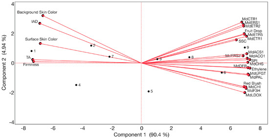 Principal component analysis of data acquired from fruit drop, ethylene production, physicochemical properties, skin color, expression of ethylene-biosynthesis-related and perception-related genes, as well as anthocyanin-biosynthesis-related genes of ‘Honeycrisp’ apples subjected to AVG and 1-MCP treatments and evaluated throughout ripening on-the-tree. Numbers correspond to the different treatments and evaluation periods/ripening stages that were examined (1 (AVG_CH), 2 (AVG_CH + 1W), 3 (AVG_CH + 2W), 4 (1-MCP_CH), 5 (1-MCP_CH + 1W), 6 (1-MCP_CH + 2W), 7 (Control_CH), 8 (Control_CH + 1W), 9 (Control_CH + 2W)). Starch pattern index (SPI), soluble solids content (SSC), titratable acidity (TA), index of absorbance difference (IAD). Codes for genes are defined in Figure 2, Figure 3 and Figure 4.