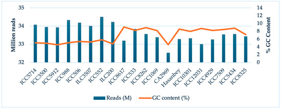 Total number of reads and GC content (%) per accession.