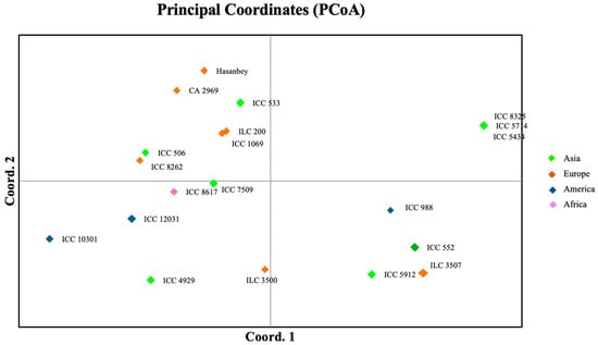 Principal coordinate analysis (PCoA) of the 20 chickpea accessions genotyped with 21 InDel markers.