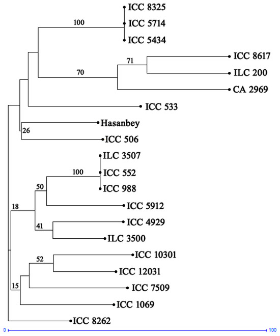 Phylogenetic tree constructed through the neighbor-joining method using InDel markers and 20 chickpea accessions.