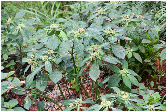 Compared to the recognition of E. dentata as an invasive species, many plants from the Euphorbiaceae family and the Euphorbia genus have received considerable acclaim in China. Plants of the Euphorbia genus, such as Langdu (E. fischeriana auct. non Steud.), Jingangzuan (E. neriifolia L.), Zeqi (E. helioscopia L.), Xusuizi (E. lathyris L.), Feiyangcao (E. hirta L.), and Dijincao (E. humifusa Willd. ex Schltdl.) are widely used in traditional Chinese medicine due to their ability to clear heat and detoxify. Additionally, contemporary methods of separation and extraction have revealed that diterpenoids (such as ingenane type and tigliane type) from the Euphorbia genus, representative of the genus, exhibit a rich array of natural product components, including terpenes, sterols, and flavonoids [10,11]. Further pharmacological research has demonstrated that natural products derived from plants in the Euphorbia genus exhibit exceptional anti-inflammatory, antioxidant, antiviral, and cytotoxic activities [10,12,13]. Therefore, investigating the chemical constituents of E. dentata through phytochemical approaches could not only aid in the discovery of novel bioactive molecules but also contribute to the research on the resource utilization of invasive plants, thereby mitigating issues related to biological invasion.