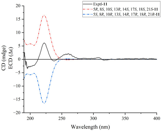 Subsequently, the conformers were optimized further using DFT at the B3LYP/6-31G(d) level in the methanol with the GAUSSIAN 16 [45]. The theoretically calculated ECD spectra of 11 were established using the time-dependent density functional theory (TDDFT) method at the B3LYP/6-311++G(2d,2p) level in methanol, and further Boltzmann averaged to compare with experimentally obtained ECD spectra by SpecDis v1.71 [46,47]. The sigma/gamma ratio for processing the calculated ECD was 0.3 eV. All data of ECD calculations are shown in Figure S14 and Tables S1 and S2.