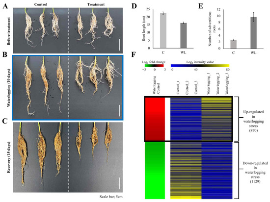 Two-week-old soybean seedlings (V2 stage) grown in an incubator were exposed to waterlogging stress for 10 days (Figure 1A,B) and then grown for a further 15 days under normal conditions as a recovery treatment (Figure 1C). Observing the roots at each stage revealed that root development was inhibited in the waterlogging-treated plants and adventitious roots (ARs) were increased (Figure 1B). The inhibition of root development caused by waterlogging stress was not resolved, even after the 15-day recovery period (Figure 1C).