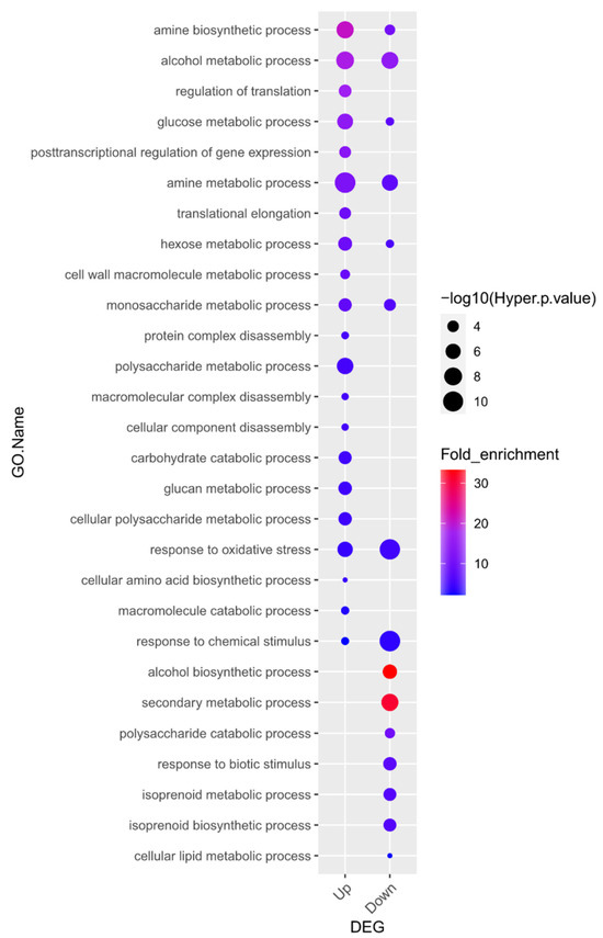 Of the identified terms, “alcohol biosynthetic process” (20.6-fold enrichment) was the most significantly enriched term in the downregulated gene group. Alcoholic fermentation, also known as ethanol fermentation, is a biological process that converts sugars into cellular energy while generating the by-products of ethanol and carbon dioxide [43].