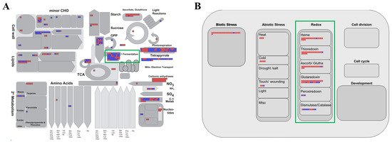 - Thimm, O.; Bläsing, O.; Gibon, Y.; Nagel, A.; Meyer, S.; Krüger, P.; Selbig, J.; Müller, L.A.; Rhee, S.Y.; Stitt, M. Mapman: A User-Driven Tool to Display Genomics Data Sets onto Diagrams of Metabolic Pathways and Other Biological Processes. Plant J. 2004, 37, 914–939. [Google Scholar] [CrossRef]