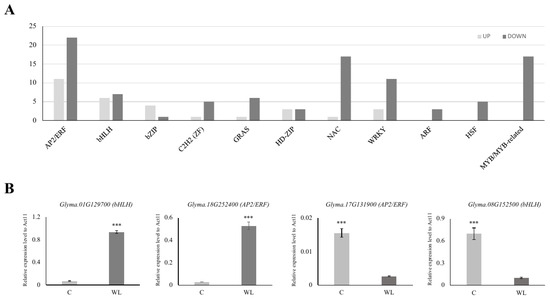 Expression analysis of major transcription factors in DEGs. Among the transcription factors, the number of upregulated genes is presented in light gray, and the number of downregulated genes is presented in dark gray (A). The expression of four randomly selected genes from the up- or downregulated genes was compared (B). C: control (light gray), WL: waterlogging (dark gray). *** p < 0.001.