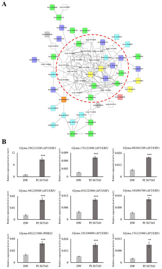 Construction and expression validation of co-functional networks associated with transcription factors regulated under waterlogging stress. (A) Co-functional network consists of various transcription factors retrieved from SoyNet. There are 19 AP2/ERF (white nodes), 1 bHLH (pink node), 1 bZIP (orange node), 4 C2H2 (ZF, yellow nodes), 14 NAC (green nodes), 9 WRKY (light blue nodes), 9 MYB (dark blue nodes), and 2 ortholog (gray nodes) in the network. Circular nodes represent upregulated genes; square nodes represent downregulated genes. The raw networks initially created in SoyNet are shown in Supplementary Figure S2. (B) The expression of nine TF genes was significantly upregulated in a resistant variety, PI 567343, than in Daewonkong under waterlogging stress, as shown by qRT-PCR. The expression levels were normalized to that of Act11 using a real-time polymerase chain reaction. DW: Daewonkong (light gray), PI 567343: waterlogging-resistant varieties (dark gray). ** p < 0.01; *** p < 0.001.