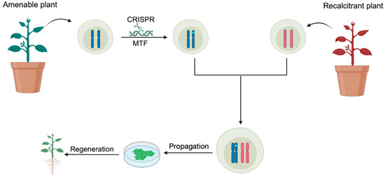 Strategies for application of current breeding biotechnologies in gene transformation-recalcitrant plants via somatic hybridization. The plant that is amenable to gene transformation serves as an intermediate to incorporate gene cassettes. Somatic hybridization combines the two genomes with the gene cassettes. Gene cassettes play roles such as gene editing and regeneration promotion in the hybrids.